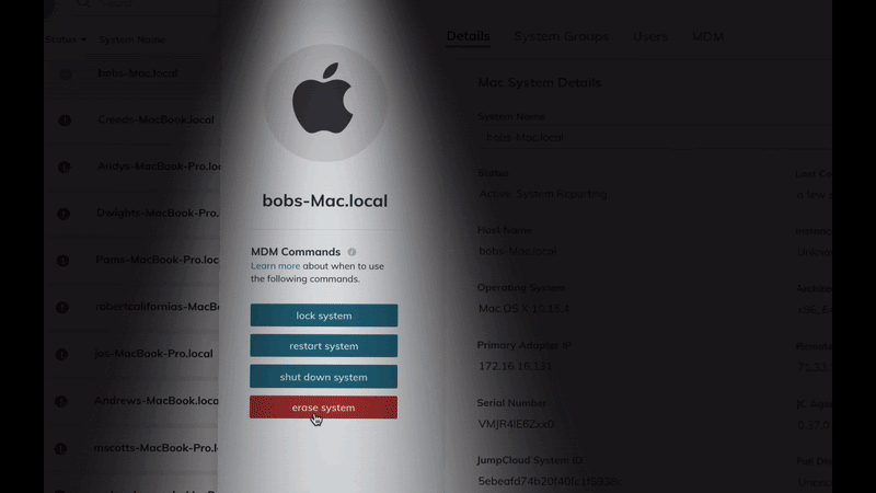 JumpCloud admins register their organization as an MDM Server with Apple in a few clicks and unlock system management capabilities only available through Apple MDM, including remote lock, restart, shutdown, and wipe.
