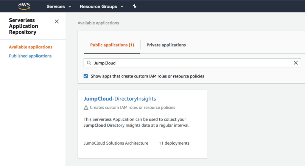 Now, we’ve released the JumpCloud Directory Insights Serverless application to further empower JumpCloud administrators to expand the use and duration of their Directory Insights data. Using the power of Amazon Web Services’ Serverless architecture, we’ve provided a quick and easy way for JumpCloud admins to deploy the infrastructure required to automatically collect and store their Directory Insights data within their own AWS account.