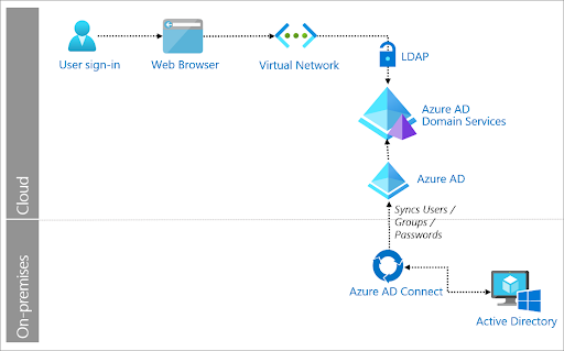 Azure AD doesn’t come with cloud LDAP functionality, so you’ll need to maintain an LDAP server, as well as service on-prem LDAP applications and MFA solution, if required. Azure AD DS is also required to sync passwords and group memberships from Active Directory. Azure AD DS allows organizations to migrate legacy applications to Azure entirely, but that service represents an additional cost as well as the work around the migration of applications which is not an easy task in most instances.
