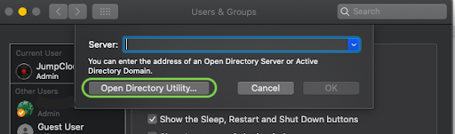 A pop-up shown in Figure 2 will appear. Click Open Directory Utility as shown in Figure 2.
