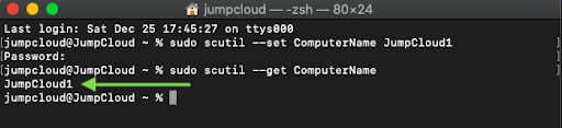 After renaming the computer, the terminal will not display any message or notification to confirm the success of the change. However, you can use the –get flag to check your work. All you need to do is to run and execute the text below. As seen in Figure 3, the computer name is now JumpCloud1.