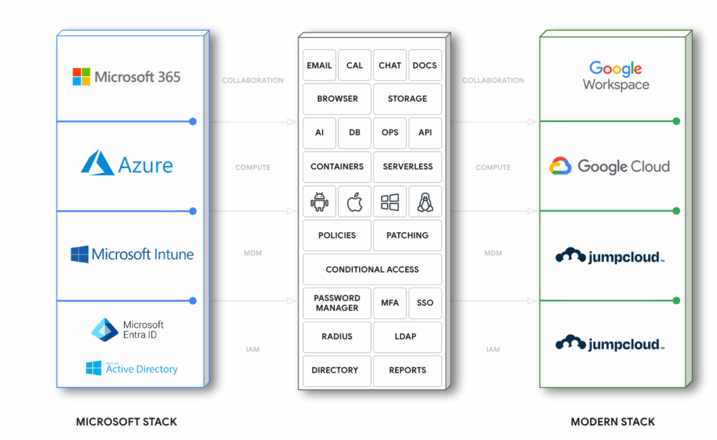 This is the definitive answer for enterprises ready to cut the cord on decades-old technology, often rooted in the Microsoft ecosystem, that simply wasn’t built for today’s cloud-forward / hybrid world. The Work Transformation Set offers a clear, consolidated path to true digital transformation, eliminating the operational downtime and spiraling costs of maintaining those complex, rigid IT infrastructures. This often includes Active Directory, Entra, and Intune as the base technology cementing enterprises to Microsoft’s bundled suite, perpetuating lock in and elimination of choice for best of breed technologies in any of these critical areas: identity, device management, and workforce collaboration and productivity. At its root, the combination of JumpCloud and Google Workspace provides the pathway forward, eliminating the prior concerns that there was no solution set available to evolve away from and into a cloud-native IT world.