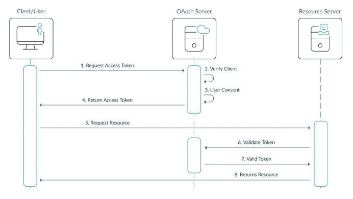 The authorization server is at the center of the OAuth workflows and grants consent, fielding requests for access and granting temporary tokens that a client “cashes in” at a resource server.