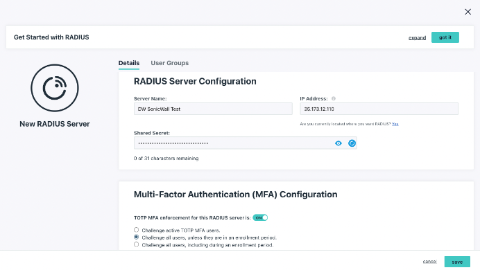 - Toggle the TOTP MFA Enforcement for this RADIUS server option to “On” to enable MFA for this server. This option is “Off” by default.
