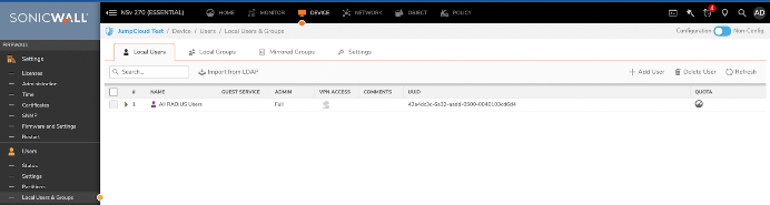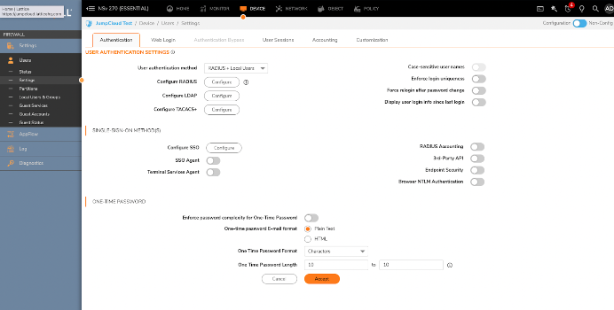 You’ll use the information contained in JumpCloud’s RADIUS interface to create a new RADIUS server entry on your firewall. Navigate to Device / Settings / Users /Settings. You’ll notice a button to “Configure RADIUS,” which is where you’ll set up your JumpCloud RADIUS server.