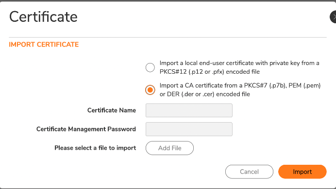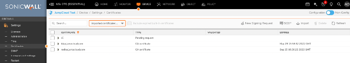 EAP/TLS will not work until you take the additional step of importing a RADIUS certificate from JumpCloud. It’s available here as a .crt file, and SonicWall will import it. You’ll then be prompted to restart your virtual appliance to install the certificate.