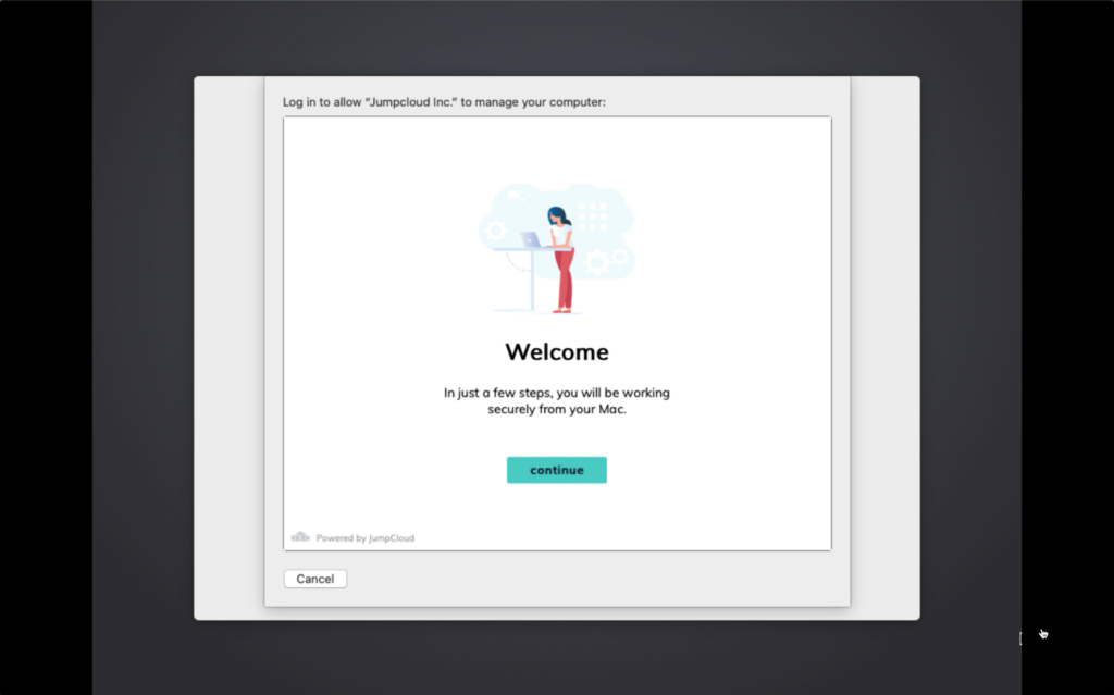 Once the device is synced into JumpCloud MDM, the device opens a web browser on first boot during the Automated Device Enrollment. This web browser will connect to JumpCloud’s servers to fetch a Welcome Screen that is customizable by the administrator.