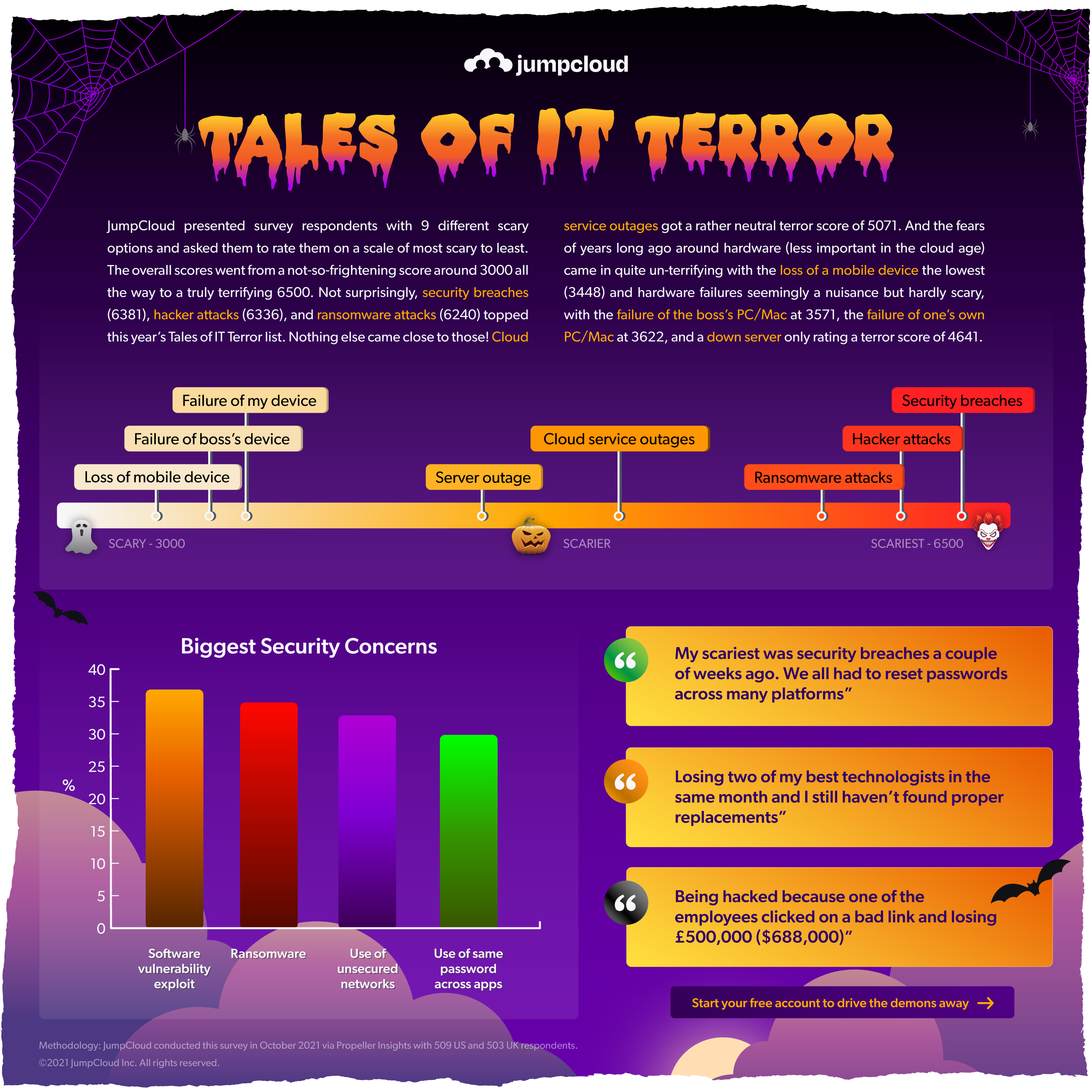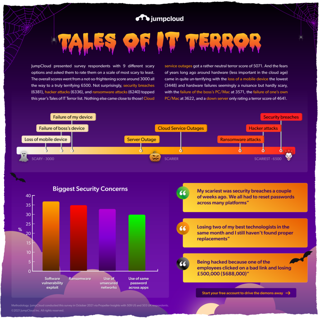 In this blog, we’ll cover the top three IT security scenarios respondents overwhelmingly ranked as the scariest. We’ll dive into why they’re so scary, what you can do to defend against them (spoiler alert: avoid dark basements and cornfields), and how businesses are pivoting in reaction to them.