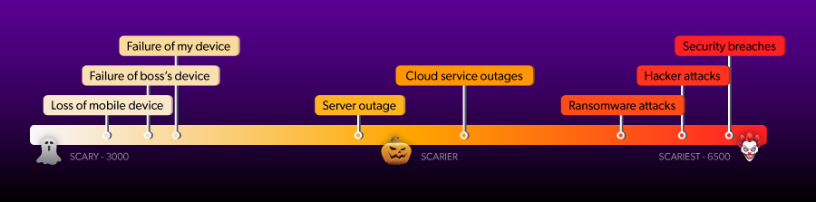 The rest of the scenarios presented were ranked far less scary than the top three above (a cloud service outage, an ISP or CDN outage, a down server, the respondent’s device going down, the boss’s device going down, and a lost mobile device). Why is that?