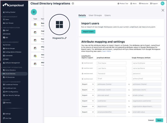 User lifecycles start with onboarding, and JumpCloud makes it easy to import identities and attributes from identity providers (IdPs) including Active Directory, Microsoft 365, and Google Workspace. JumpCloud also extends support to HRIS services, to automate and schedule new user provisioning. Imported attributes can be used to determine group memberships, which saves admins time and mitigates errors, compliance, and security risks.