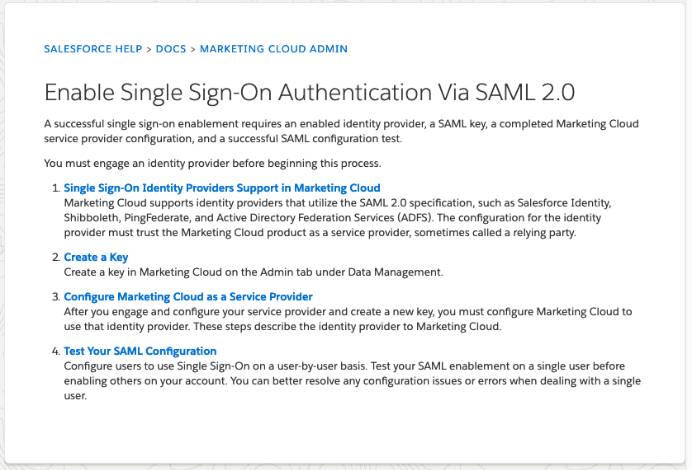 La siguiente imagen muestra las instrucciones de Salesforce para configurar Marketing Cloud para SAML SSO.