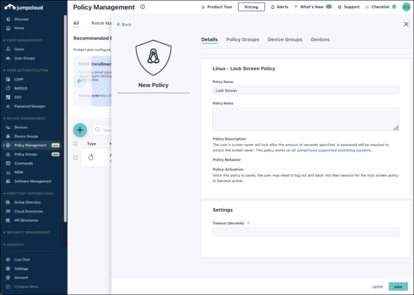Manage Linux endpoints with the same flexibility, control, and platform as other devices, without the need for custom code and configurations. Leverage JumpCloud’s admin-friendly UI and templated policies to make Linux device management accessible to your team, get devices up and running quickly, and reduce the risk of manual errors.