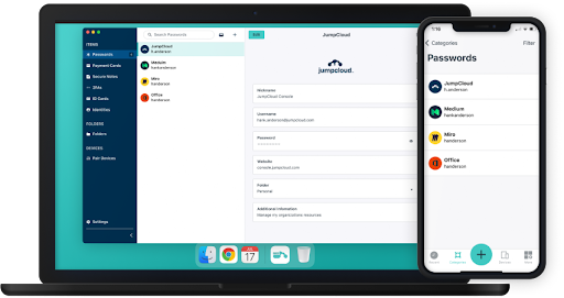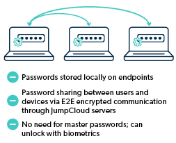 JumpCloud’s open directory platform includes a password manager built on the decentralized architecture described above. Passwords are stored locally and synced in an end-to-end encrypted manner between the devices you choose, with no master password needed to access the vault.