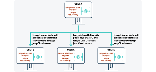 When a change is made to a password in a shared folder, the app that made the change encrypts then signs a “sync” message with the public keys of every member of the folder. These “sync” messages are then relayed through JumpCloud servers to all of the apps of the different users in the folder.