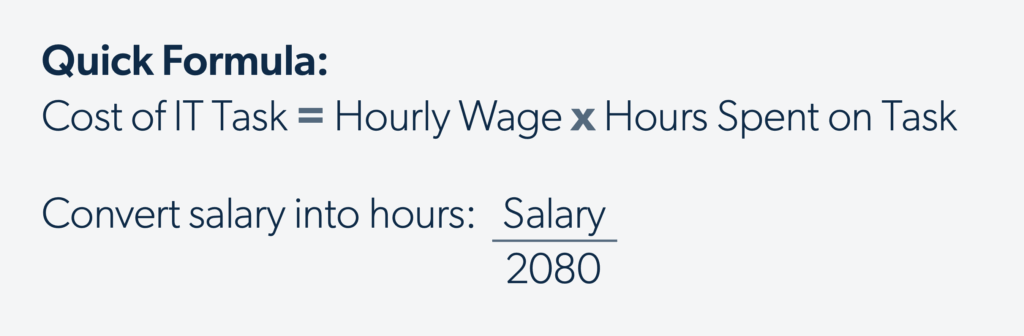 Typically, these are the labor costs associated with configuring, supporting, and managing your IT rather than the costs associated with day-to-day activities and job function. These costs are usually calculated by determining the hourly wage of the person responsible for the task. For salaried workers in the U.S., divide their yearly salary by the number of hours in a typical work week, and multiply the result by the number of working weeks in a year; a standard 40-hour work week equates to 2080 total working hours. Multiply the resulting hourly rate by the number of hours spent on the task.