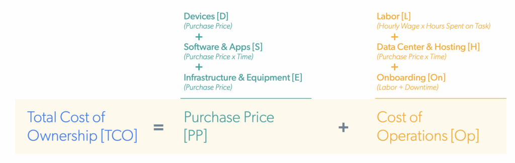 Purchase Price (PP) and Cost of Operations (OP) can usually be broken into six categories, which we’ll treat as variables when calculating TCO: