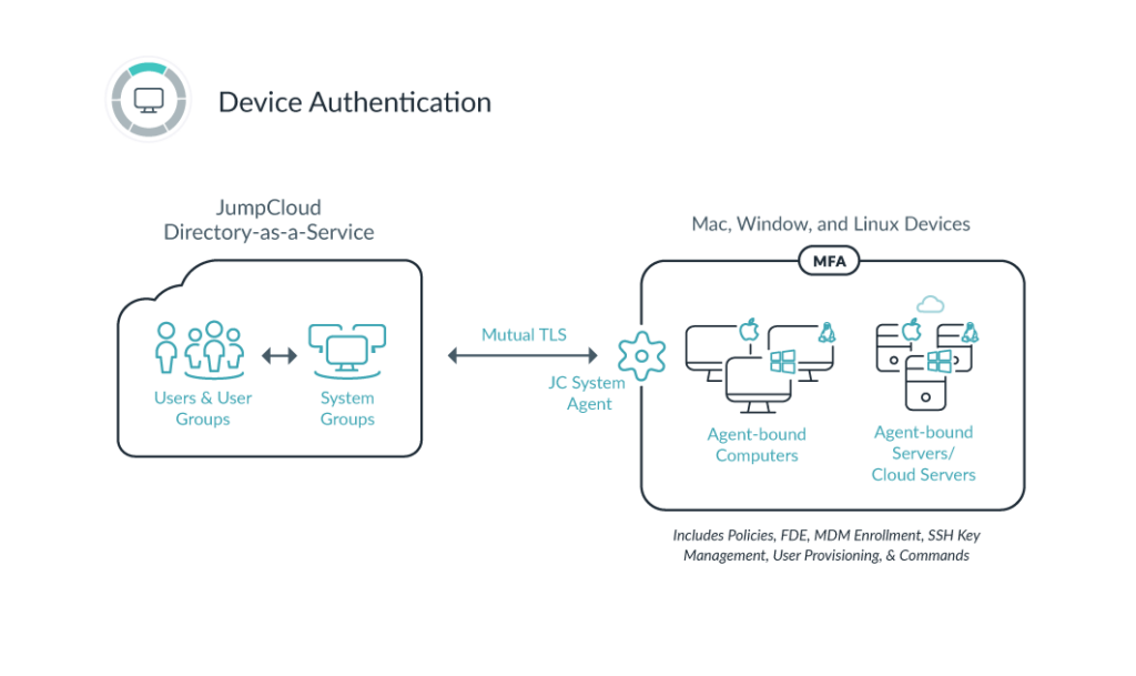 The JumpCloud system agent communicates to JumpCloud through secure channels over HTTPS/443, which ensures all updates, changes, removals, and additions to systems are carried out in a secure method. The agent communicates with JumpCloud in a 60-second cadence, meaning any changes you make to the system, bound users, or Policies are all updated within 60 seconds.