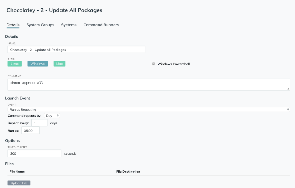 With JumpCloud Commands, you can also call Chocolatey to update Chocolatey-managed applications on a specific schedule, such as everyday at 0500 UTC as shown in the following example.