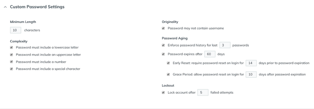 Password settings and Policies are under the User Accounts section within the Custom Password Settings dropdown. Here, you can set the minimum character limit, types of characters required, maximum number of failed login attempts, length of password history, and more.