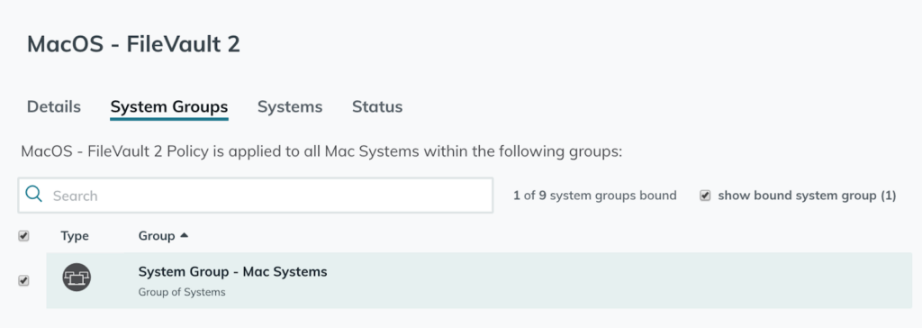 System Groups in JumpCloud are primarily used for two purposes: User Group access on multiple systems and enabling security policies on systems bound to the System Group.
