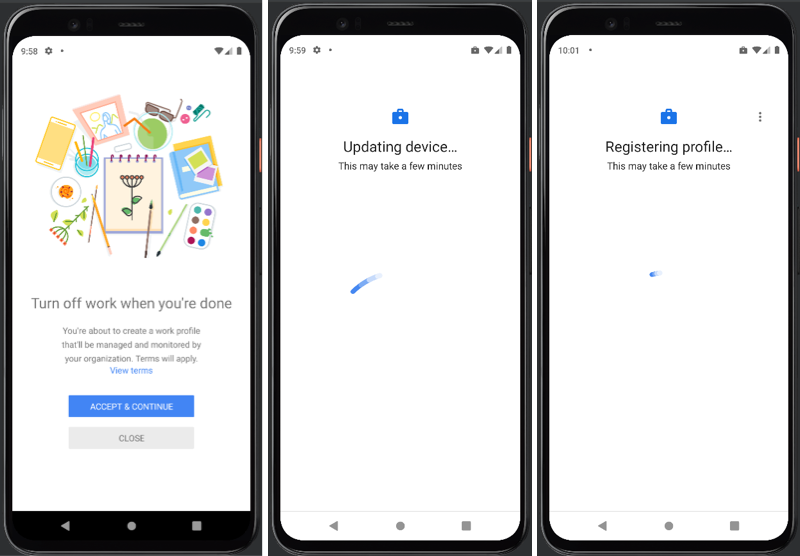 - On the mobile device, tap ACCEPT & CONTINUE and follow the on-screen instructions to create a work profile.