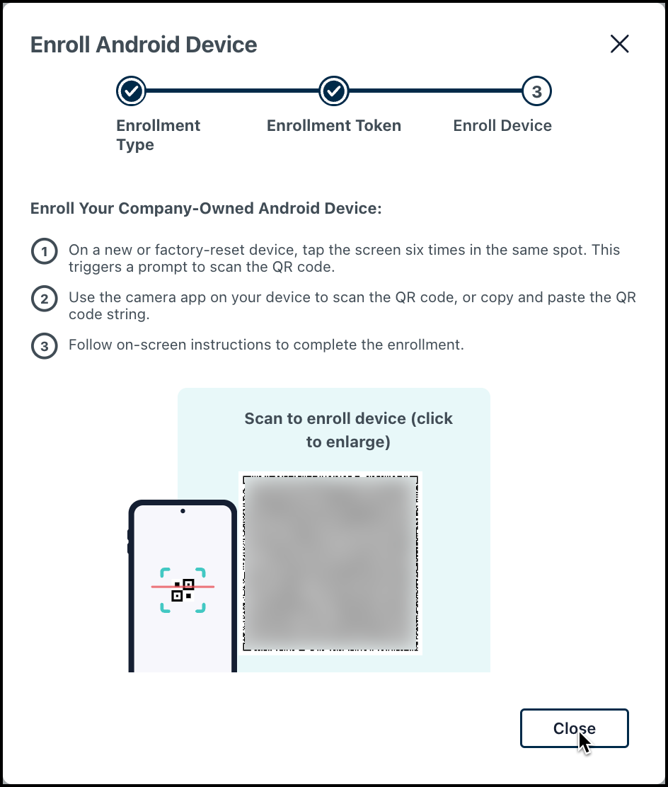 - Scan the QR code in the Admin Portal with the company-owned device. If QR scanning is not possible, manually enter the enrollment token to proceed.