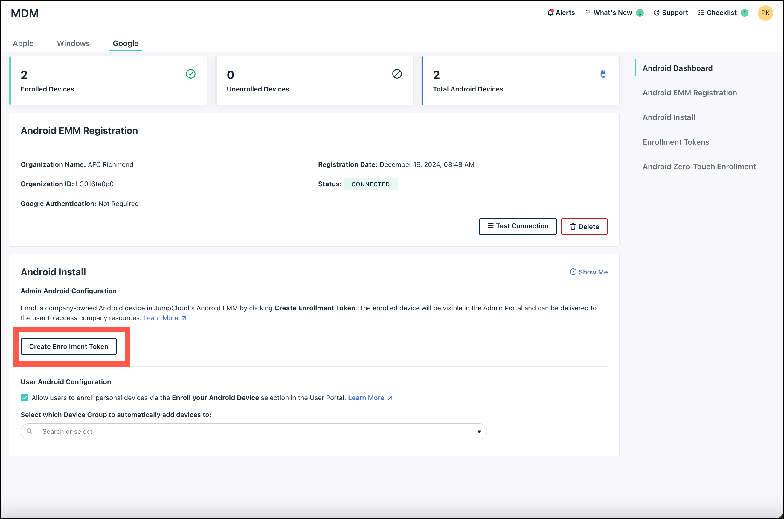 - Your enterprise is registered with JumpCloud Android EMM. See Set Up Android EMM to learn more.
