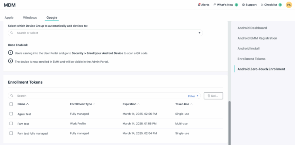 To delete an enrollment token, select the checkbox next to the token you want to delete, and click Delete.