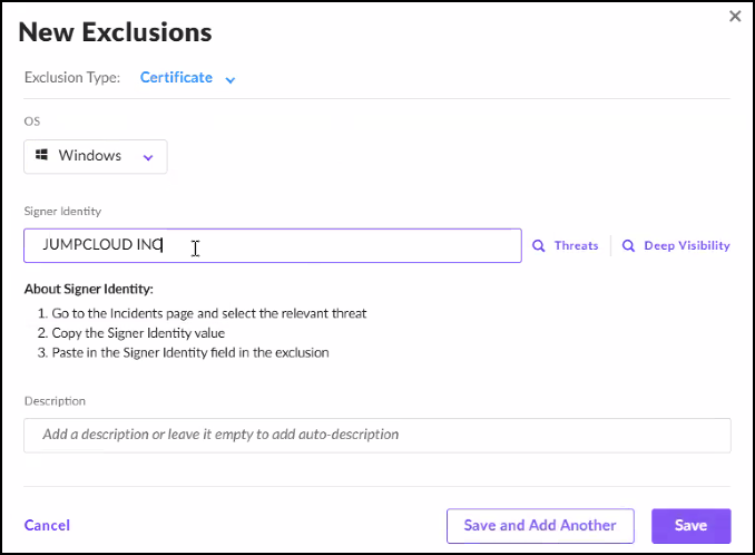 Additionally, add an exclusion for JumpCloud's certificate signing identity, JumpCloud Inc.