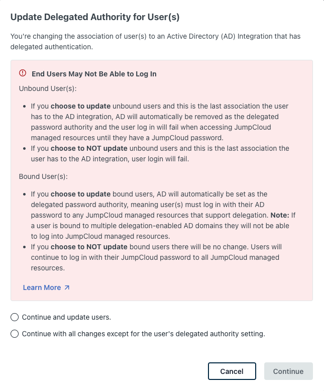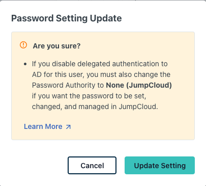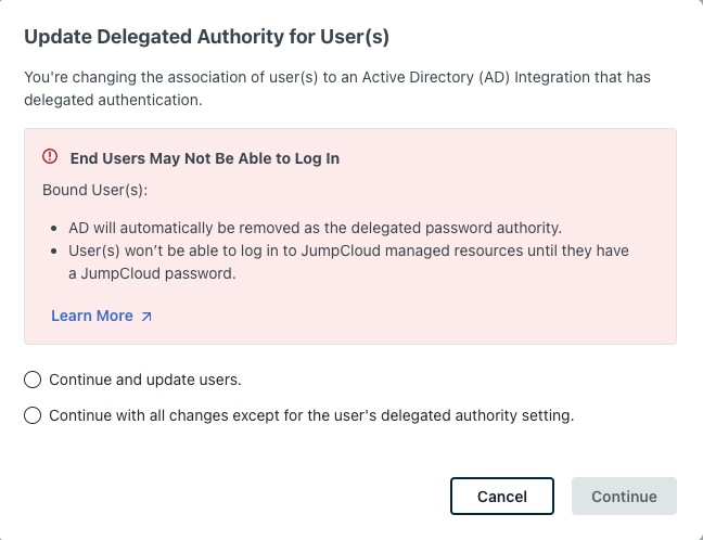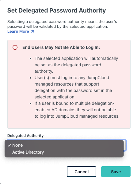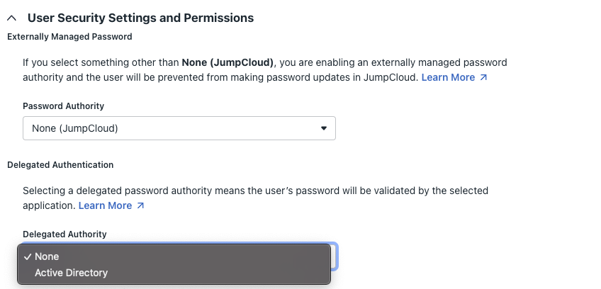 - Delegated Password Validation - default setting for enabling and disabling delegated authentication to AD for users imported from AD to JumpCloud (applicable in the Manage users and passwords in either system or both and Manage users and passwords in Active Directory deployment configurations)