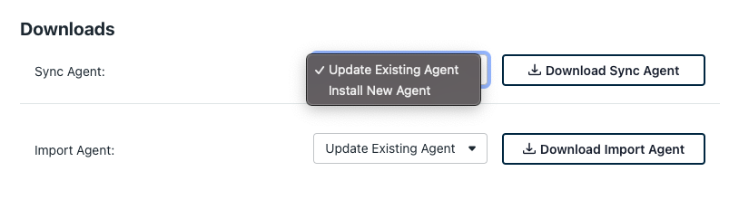 - Update Existing Agent downloads the agent installer without generating a new agent connect key