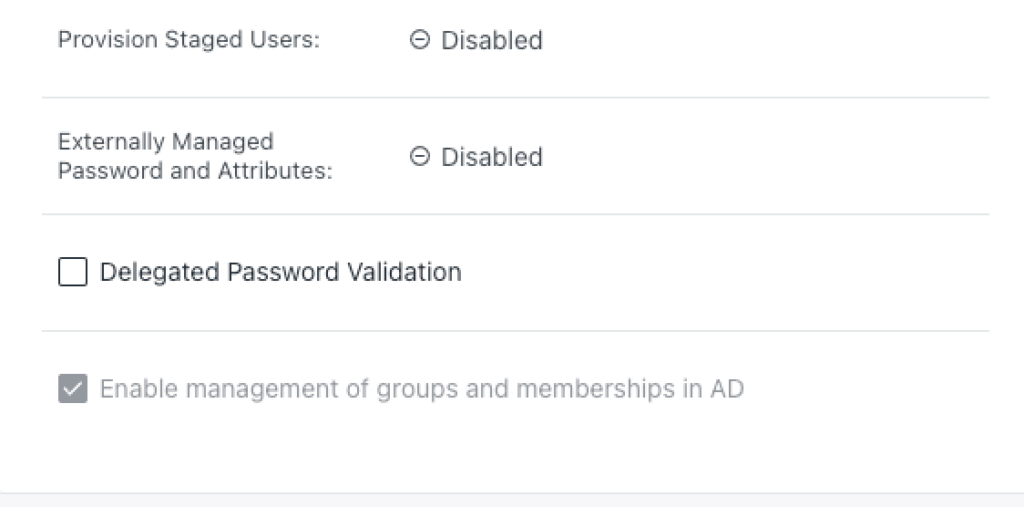 - Provision Staged Users - default setting controlling whether a staged user is synced from JumpCloud to AD when a sync agent is installed on an AD server (applicable in the Manage users and passwords in either system or both and Manage users and passwords in JumpCloud deployment configurations). This is a read-only setting