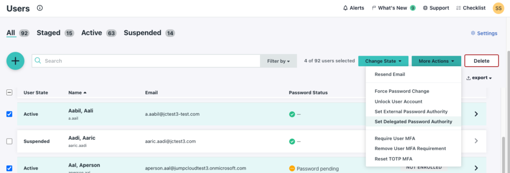 - New Set Delegated Password Authority option in the More Actions menu on the Users Page
