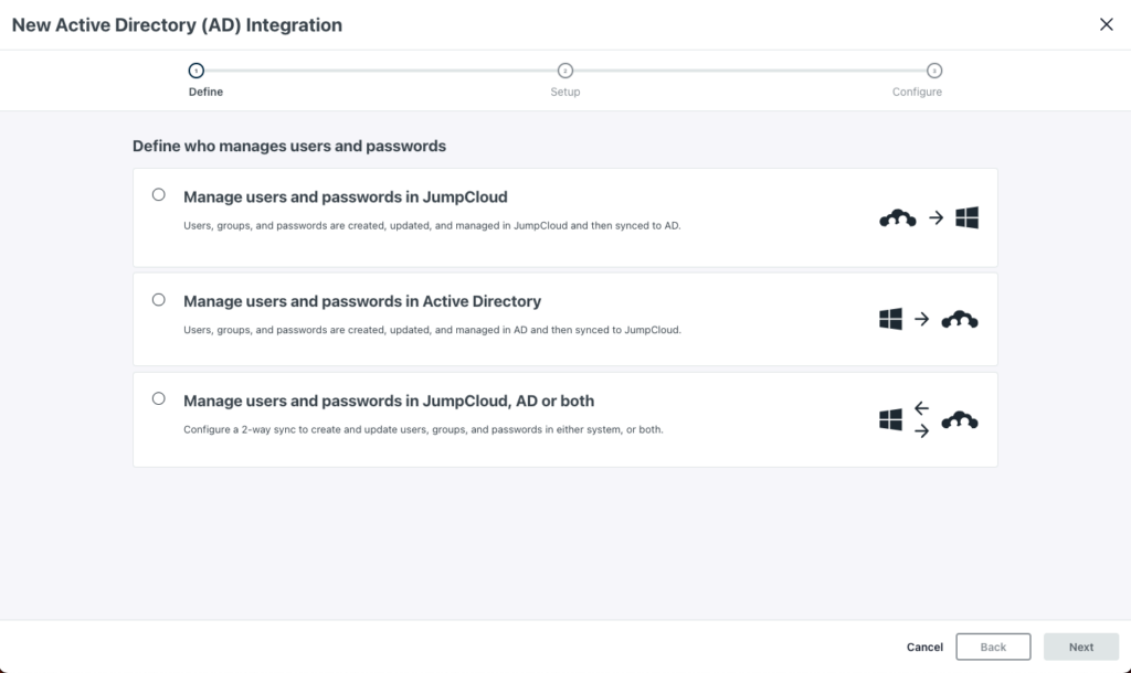 - In the Manage users and passwords in JumpCloud, AD or both (bi-directional sync) and Manage users and passwords in JumpCloud (one-way sync from JumpCloud to AD) deployment configurations, users that are in a nested OU can now be added to security groups in AD from JumpCloud. These users can only be removed from an ADI specific security group named “JumpCloud” and security groups nested underneath that security group.