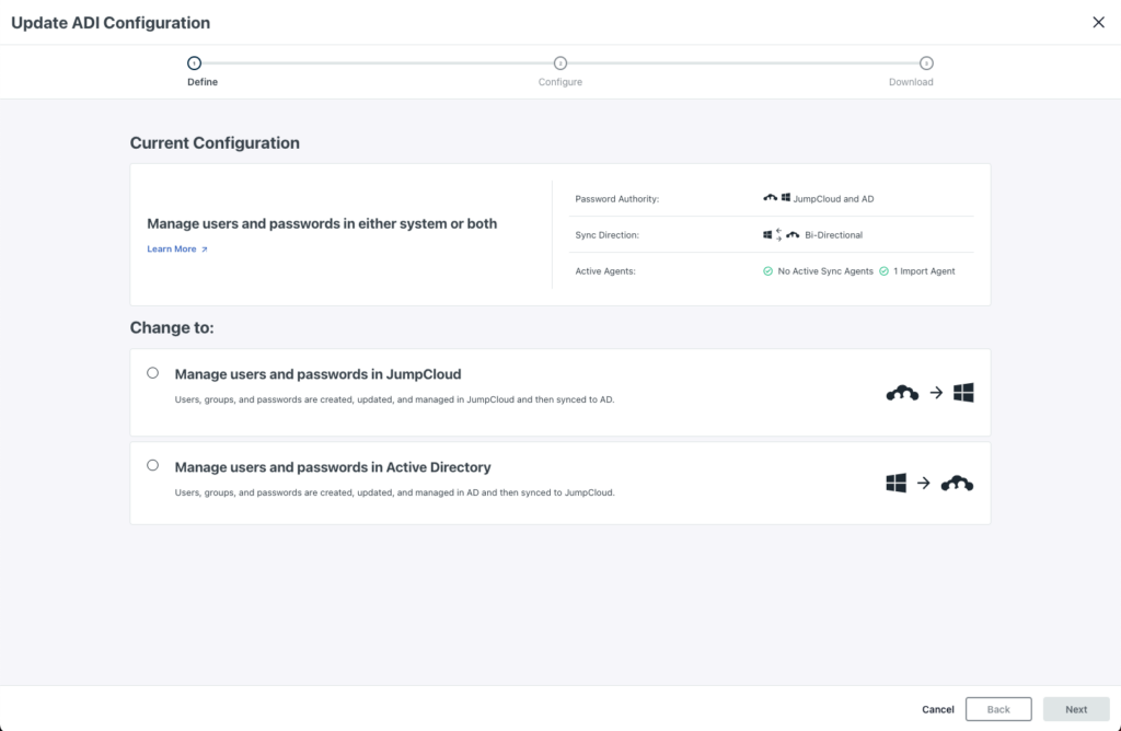 - In the Manage users and passwords in JumpCloud, AD or both (bi-directional sync) and Manage users and passwords in JumpCloud (one-way sync from JumpCloud to AD) deployment configurations, users can now be removed from any security group except the main ADI group (e.g., “JumpCloud” or “JumpCloud (mydomain1)”)