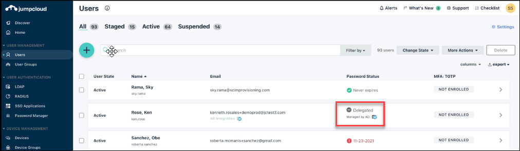 - Password status shows “Delegated” for users that have a Delegated Authority set to Active Directory