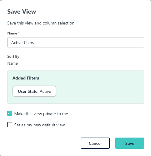 Use the Save View functionality to create different private or public views of your Users List. Any combination of column selections and filters can be saved as a 'View'.