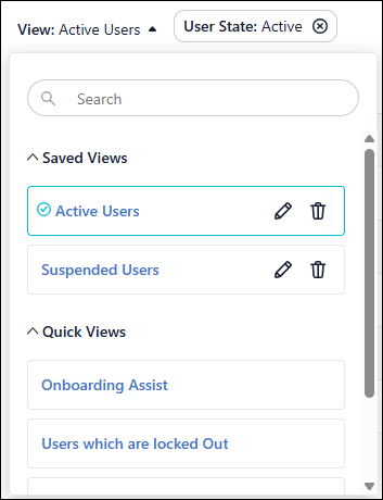- To change your view, select the View dropdown. Saved views, both private and public, will be displayed along with JumpCloud-created Quick Views.