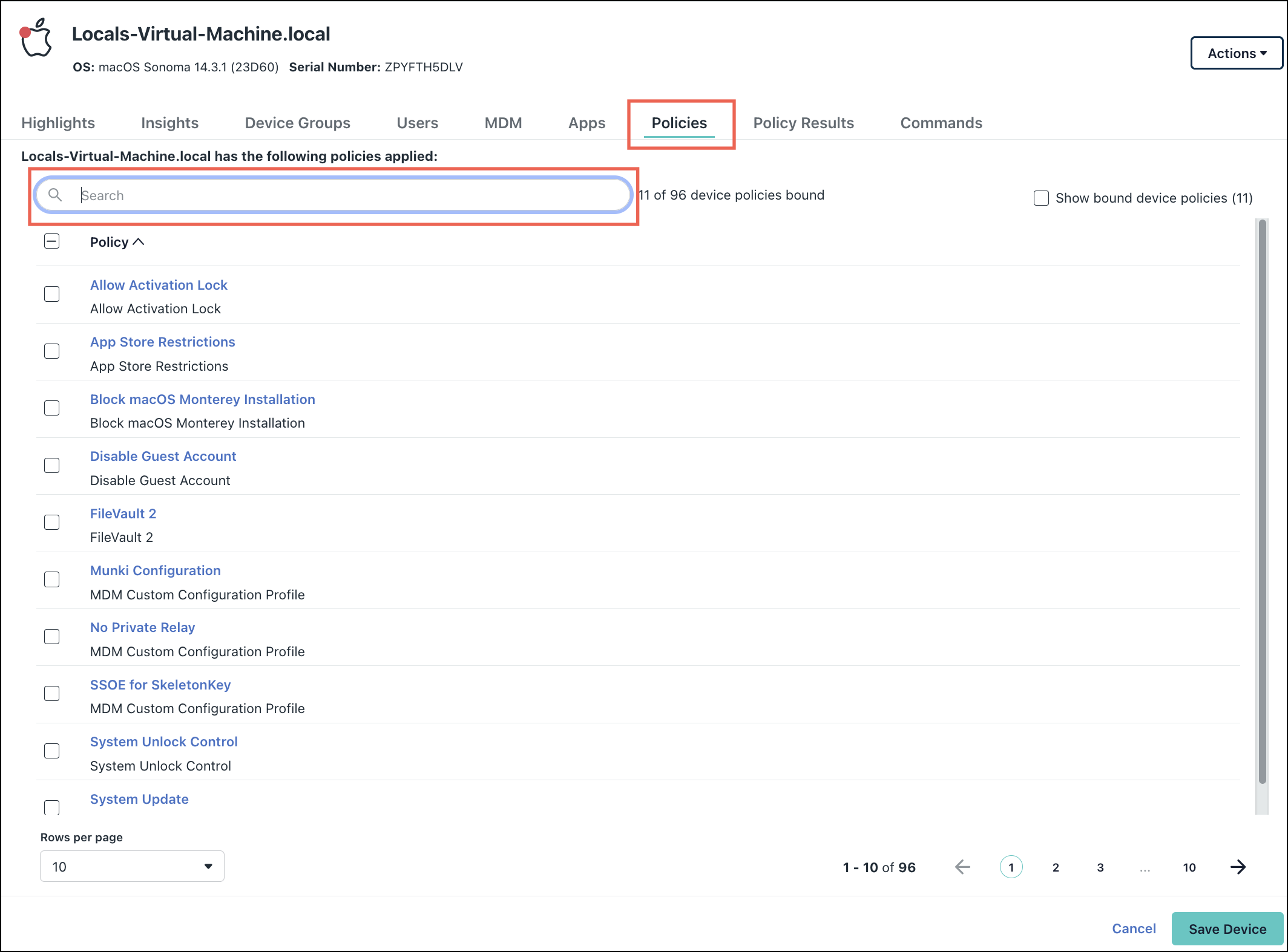 Use the Policies tab to view information about policies you’ve configured and assign a policy to the device. The Policy Results tab only appears if you have policies configured for the device.
