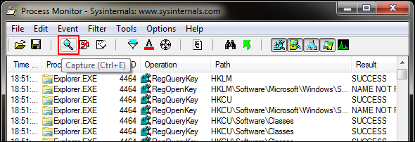 - Process Monitor begins logging the moment it starts running, but a clean capture is recommended. To stop capturing, click Capture.