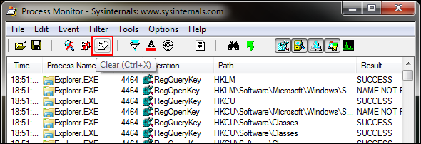 - Follow steps 1-4 in the previous section to launch Procmon, stop the default capture, and clear any previously recorded events.