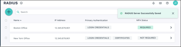 - Clicking Save will return the user to the main RADIUS screen, where the Certificate badge will display in the Primary Authentication column.