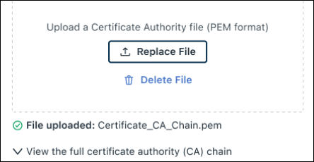 - Once the file has uploaded successfully the file name will display on the screen and options will change to replacing or deleting the file. There is also an option to view the full CA chain.
