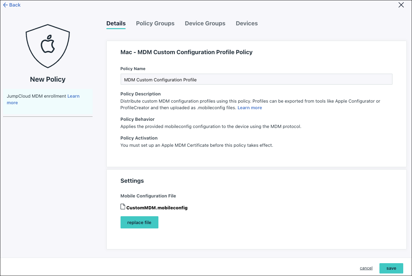 - On the New Policy panel, select the Mac tab.
