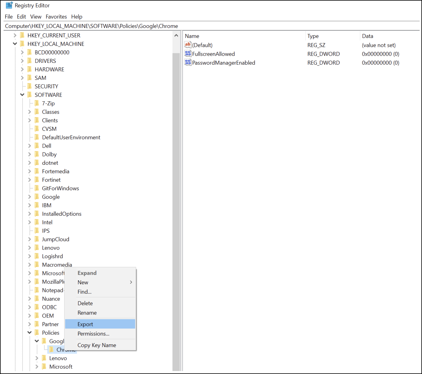 - After the settings have been set in local group policy, open the Windows registry and export the following hive to a