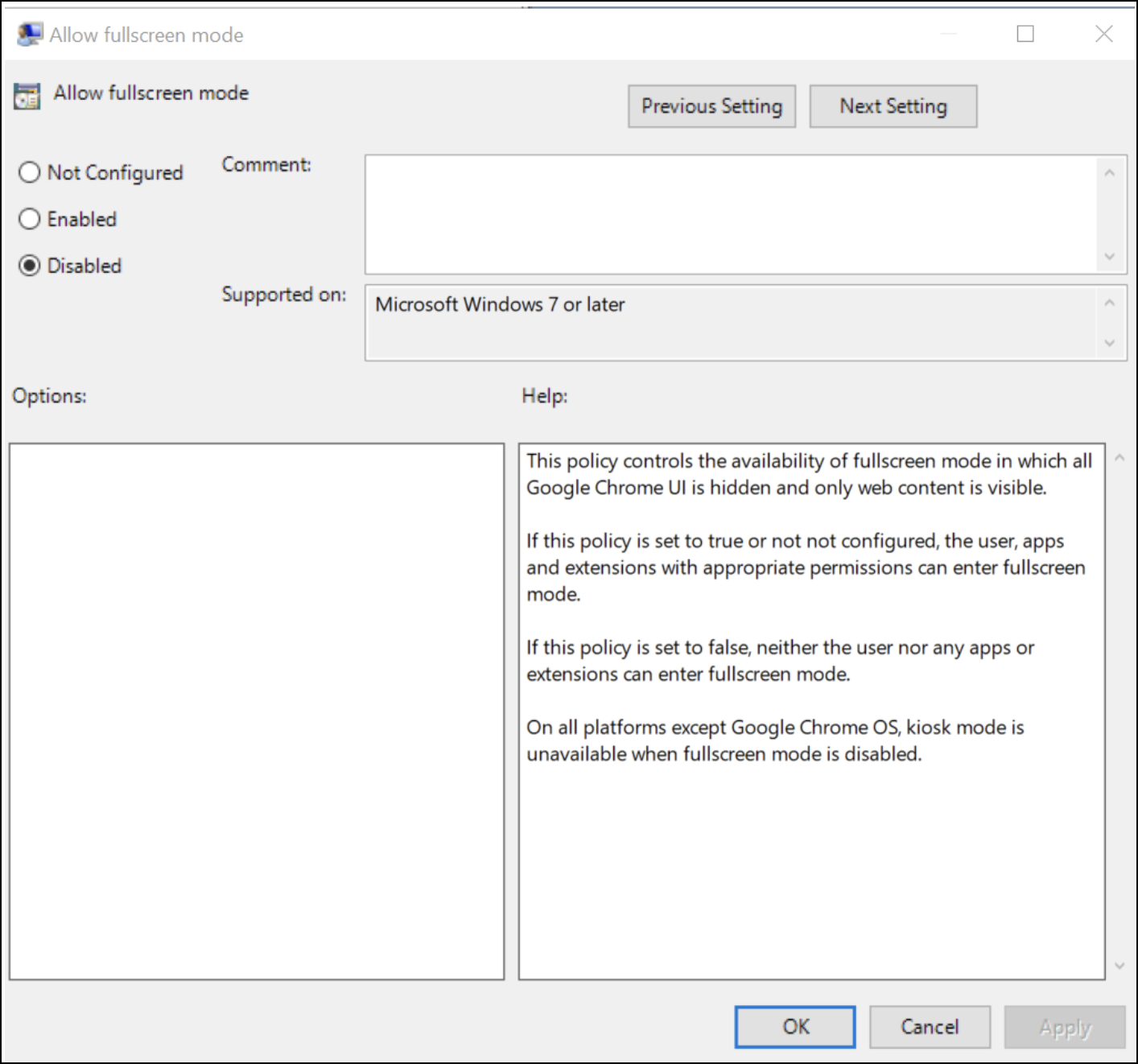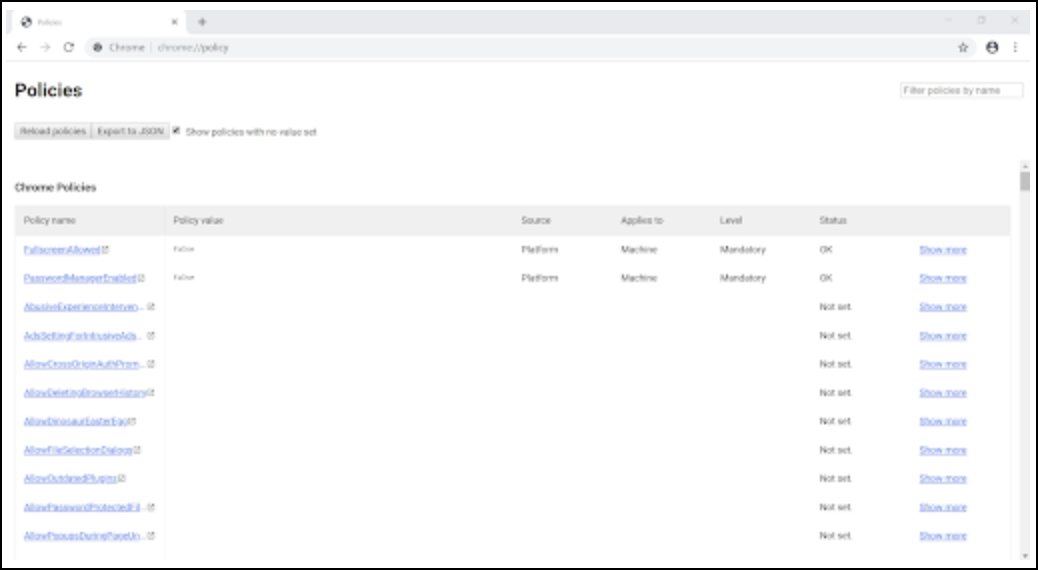 In this example, fullscreen mode and Chrome password manager are disabled.