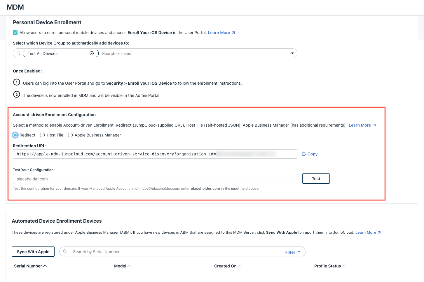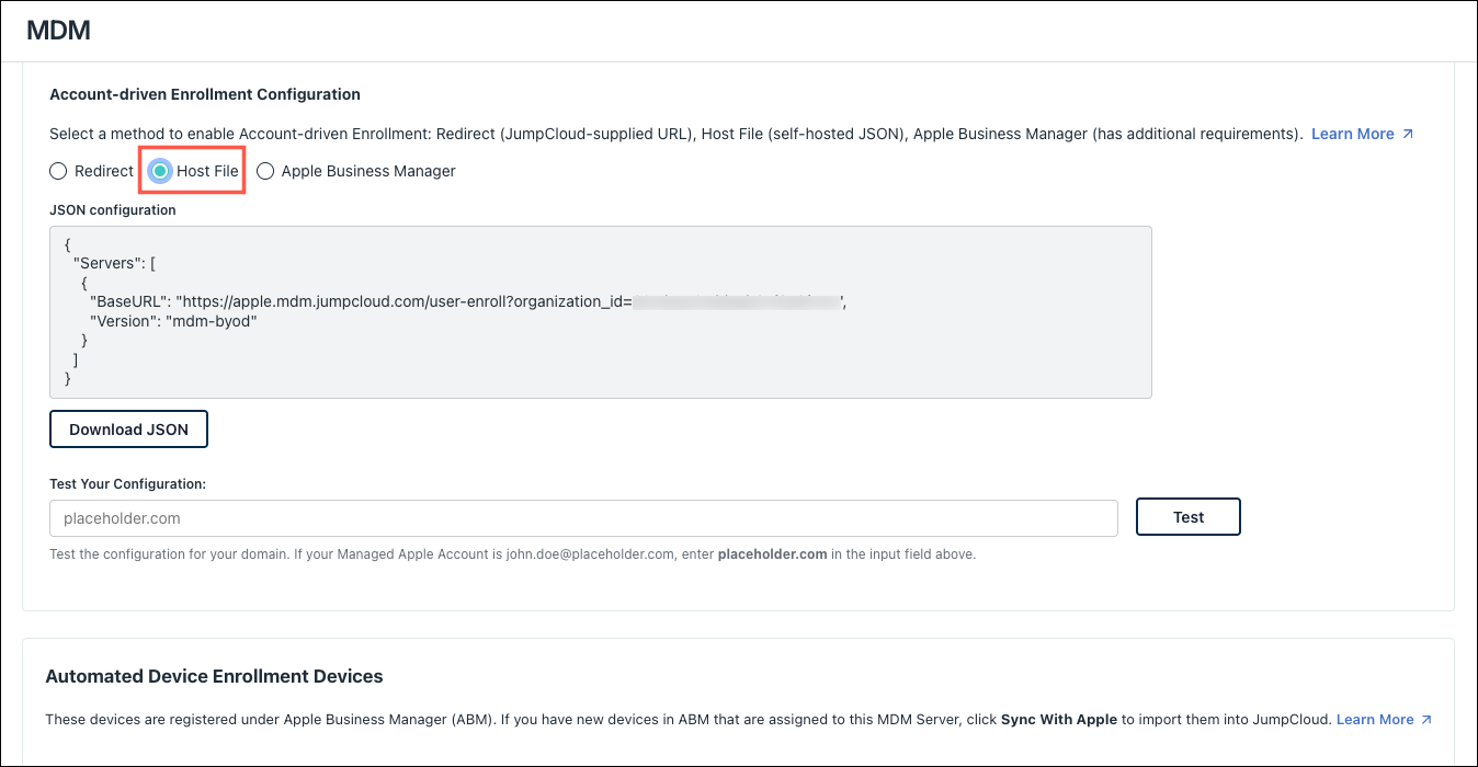 - Back in the JumpCloud Admin Portal, under Under Account-driven User Enrollment Configuration, enter your domain in the Test Your Configuration field and click Test.
