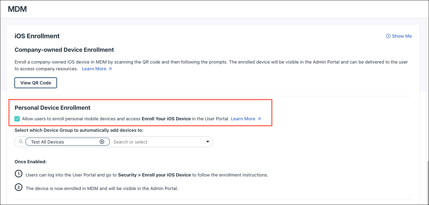 In order for users to enroll their devices, you must select the option to Allow users to enroll personal mobile devices and access Enroll Your iOS Device in the User Portal.
