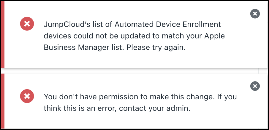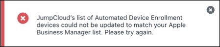 JumpCloud's list of Automated Device Enrollment devices could not be updated to match your Apple Business Manager list. Please try again.