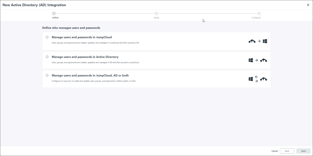 This article provides a step-by-step guide for configuring ADI to manage users, security groups, and passwords in AD, JumpCloud, or both. This configuration allows AD and JumpCloud to co-manage users, groups, and access in a full two-way sync, providing the greatest flexibility. This configuration supports: